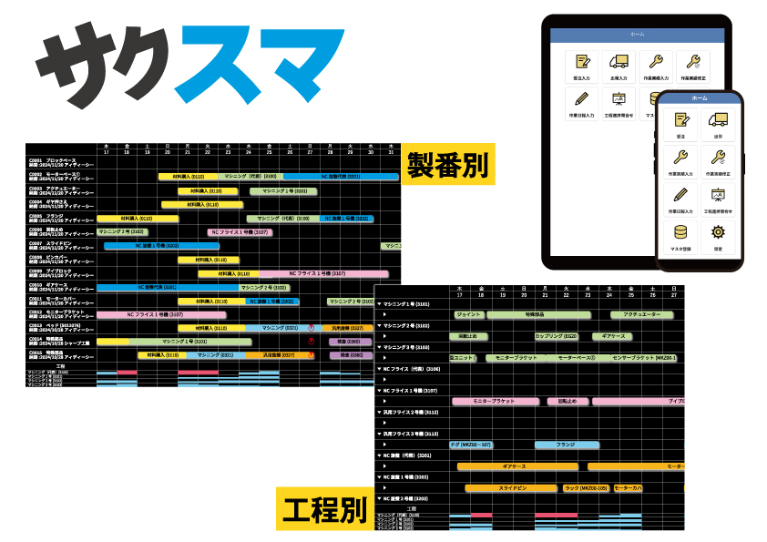 スマートフォンを使った直感的操作で簡単に工程管理ができるシステムです。受注・作業実績入力・作業実績修正・作業日報入力・工程進捗問合せ・出荷ができます。