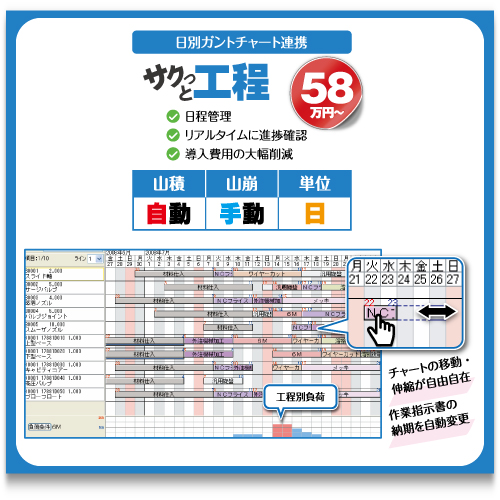 受注から出荷までを一元管理できるようになり、ガントチャートシステムと連動することで工数が大幅に削減できます。また、負荷が見えるので割込み調整が簡単にできます。