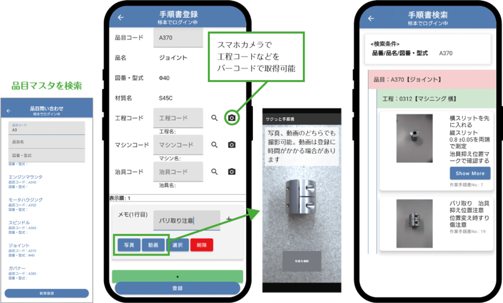 Androidスマホにて品目マスタを呼出し、写真・動画を撮影して手順コメントを紐つける簡易的な手順書システム。