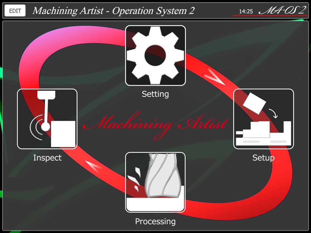 従来のNC 装置にはないオリジナル機能を多数搭載し、4 つのメニューにカテ ゴライズ。マシニングアーティストのマニアックな想いを素早く反映させることができます。