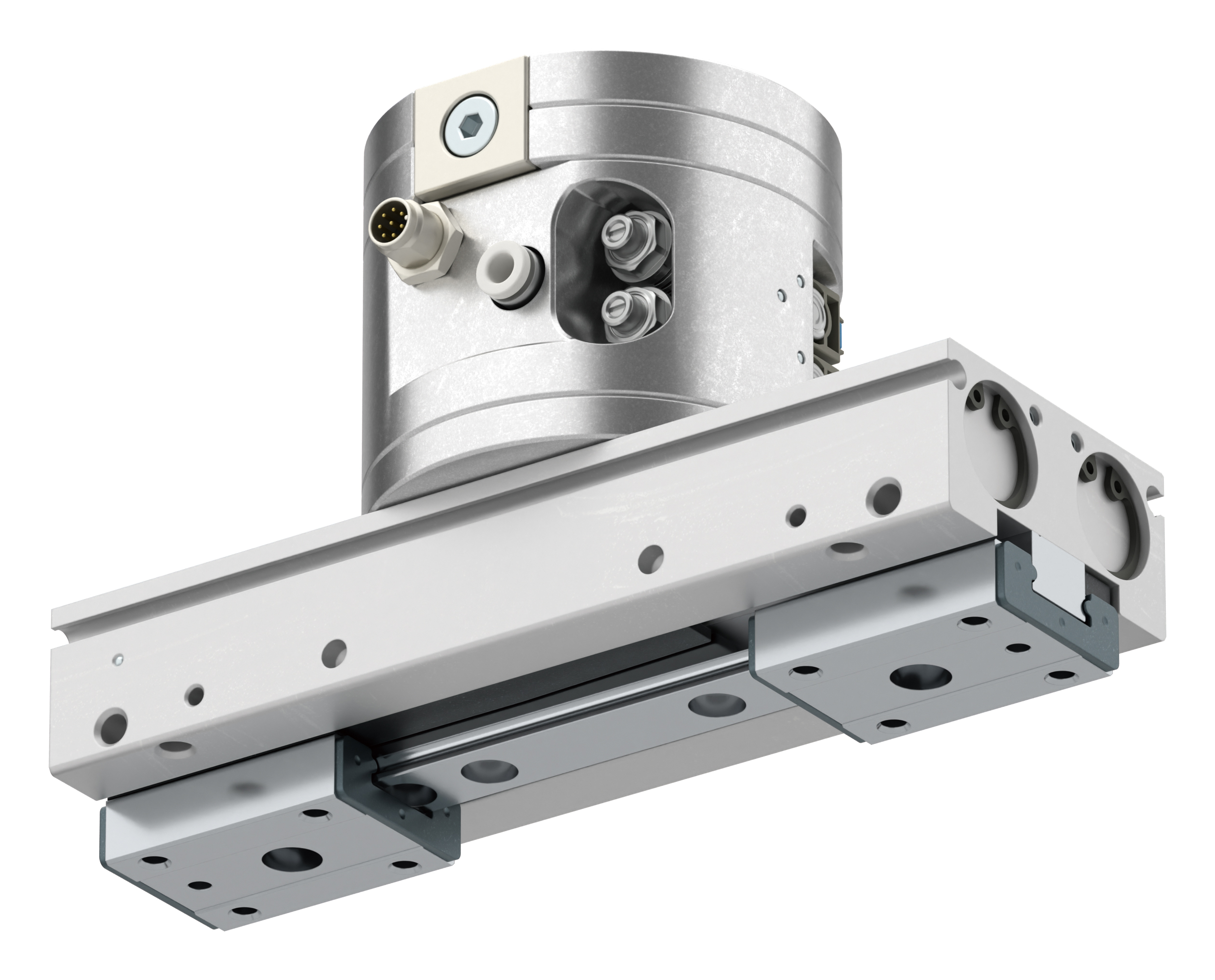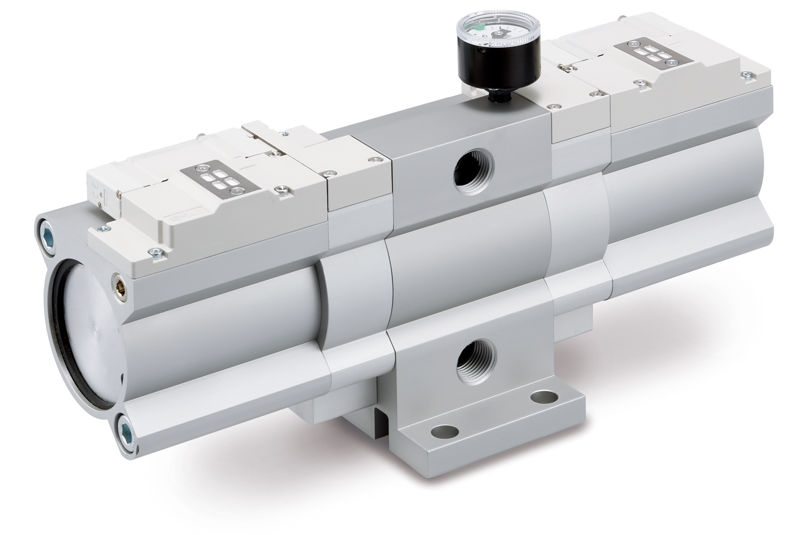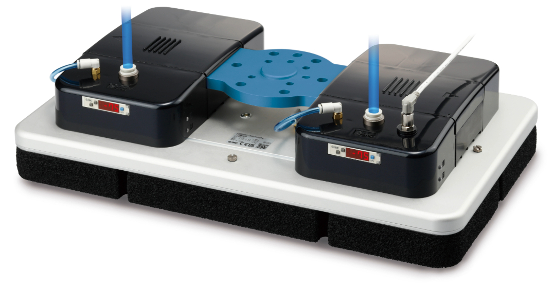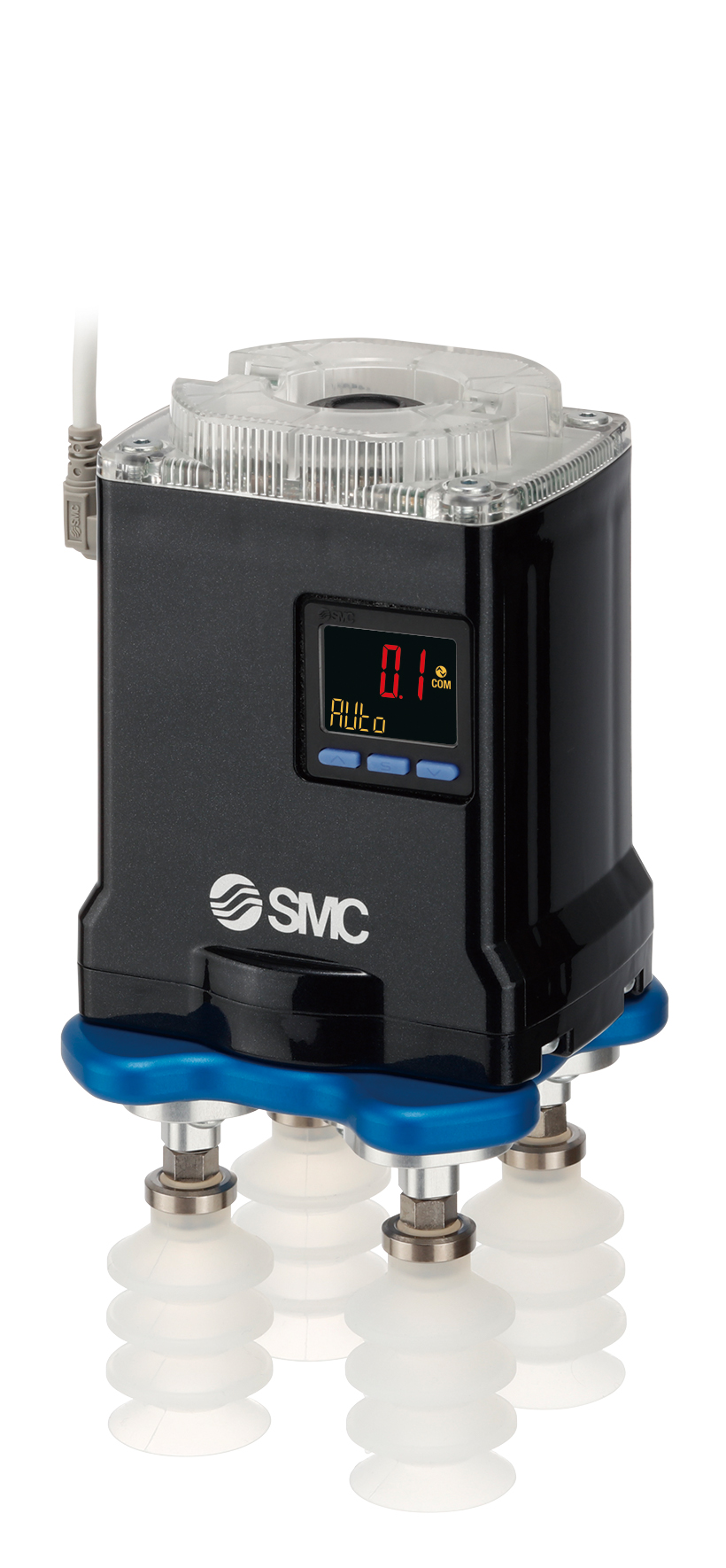エア源不要の真空グリッパ。電気配線コネクタを接続するだけで動作可能。真空ポンプ内蔵のためエア源がないところで使用可能。