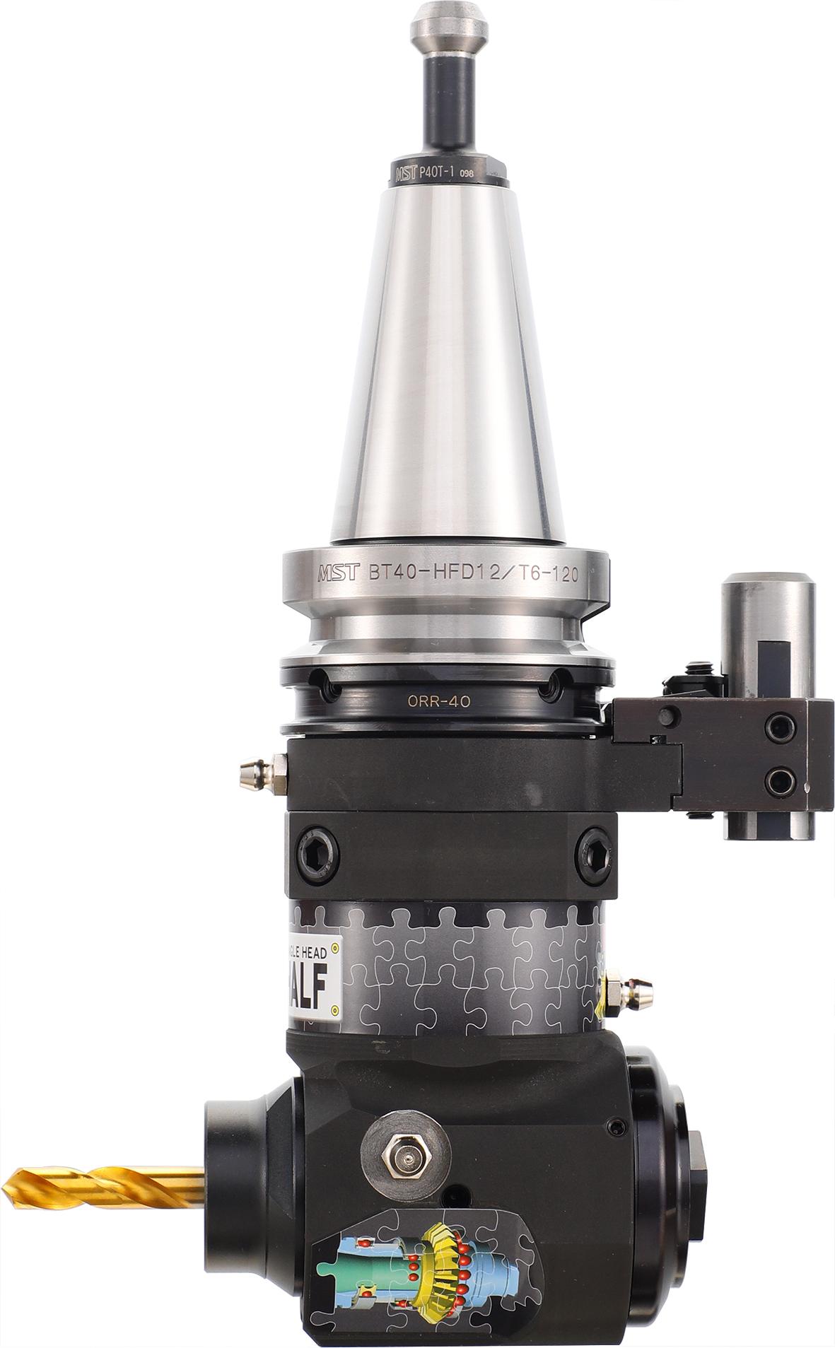 「アングルヘッドハーフ」は価格が安い、納期が早い、軽量コンパクト、自分で修理が出来ることが大きな特長。ドリル・タップ加工を主目的とした製品で、低コストで1軸付加が可能。90°型・角度設定自在のユニバーサル型、極細ヘッドのmini型をラインナップしており、工程集約を実現。BT30マシニングセンタにも対応。