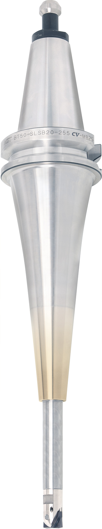 「ミルボア」は焼ばめホルダ「スリムライン」と超硬アーバを組み合わせた交換式工具用ホルダ。ワークの形状に合わせて自由に組合せが可能。ボーリング加工を「ミルボア」によるヘリカル加工で行うことで、ボーリングヘッドによる加工の問題を解決。また、底面や肩削りの加工にも最適。