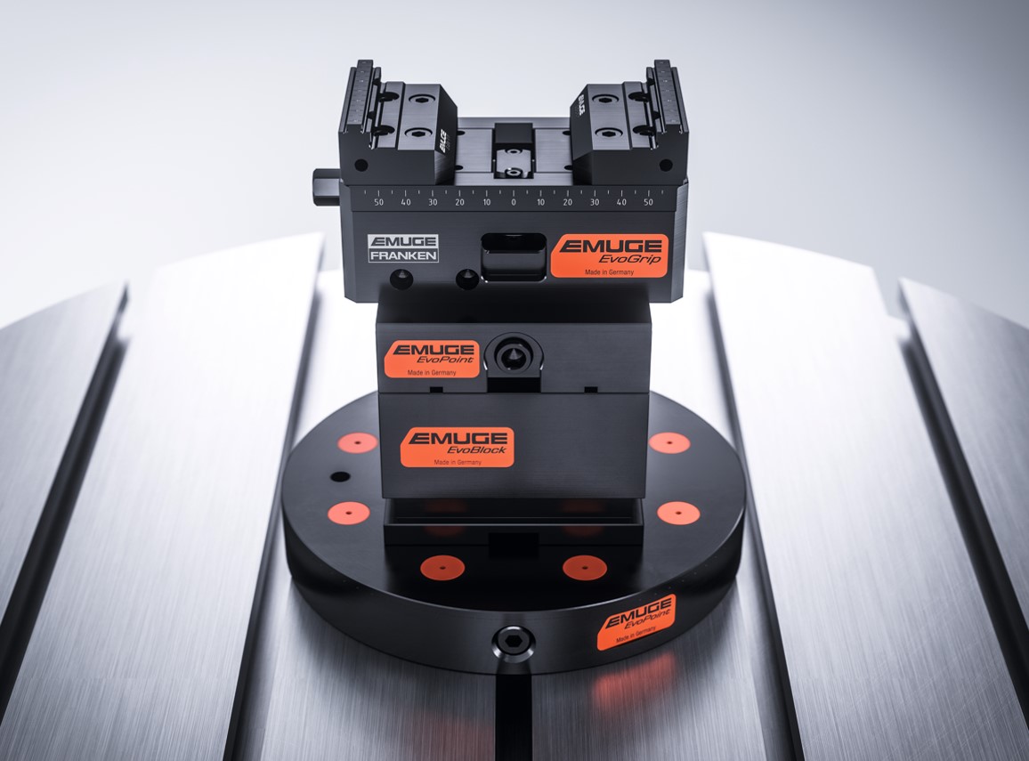 最大75(kN)もの圧倒的なクランプ力を誇るメカ式5軸センタリングバイス。これまで不可能だった加工を可能にする。ゼロポイントシステムと嵩上げ用ブロックのシリーズも展開。